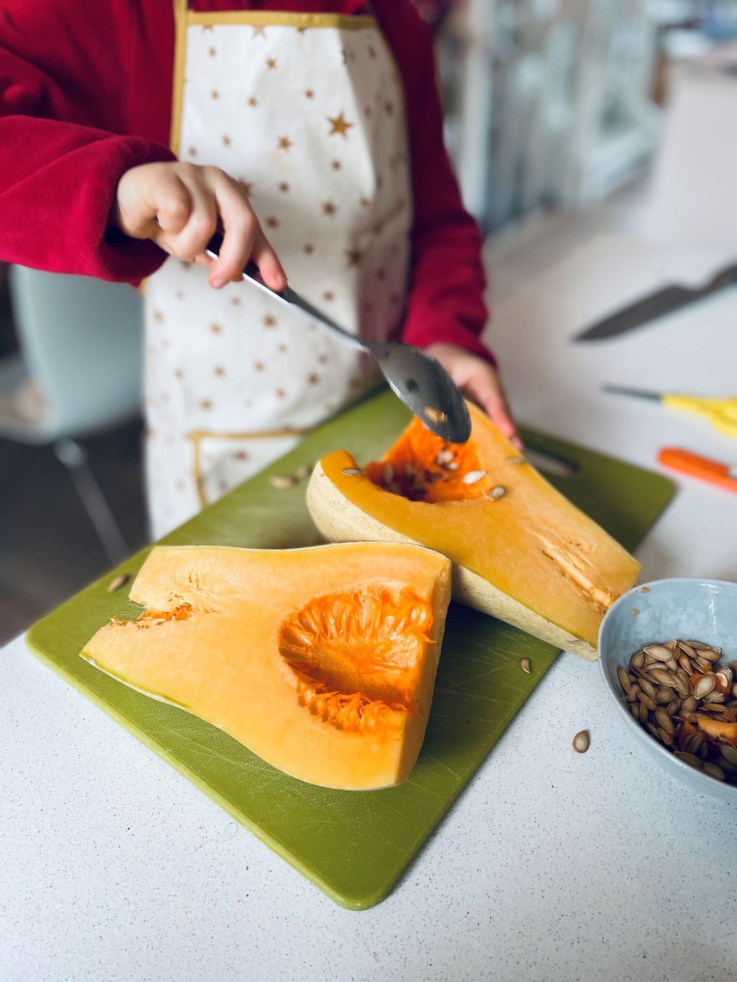 Vi sørger for en ren arbeidsflate og legger frem våre kjøkkenredskaper: En skarp, liten kniv, en skarp stor kniv, skjærebrett og en ildfast form. M samler alle matvarene vi trenger og legger dem klare. Allerede nå har hun kjent vekten av gresskaret og funnet ut at det er ganske tungt. Hun merker seg at formen er pæreformet, og skallet er veldig hardt. Jeg hjelper henne med å dele gresskaret i to. Jeg er nøye med å forklare hva jeg gjør underveis: Nå deler jeg gresskaret. Ser du, to nesten like deler!