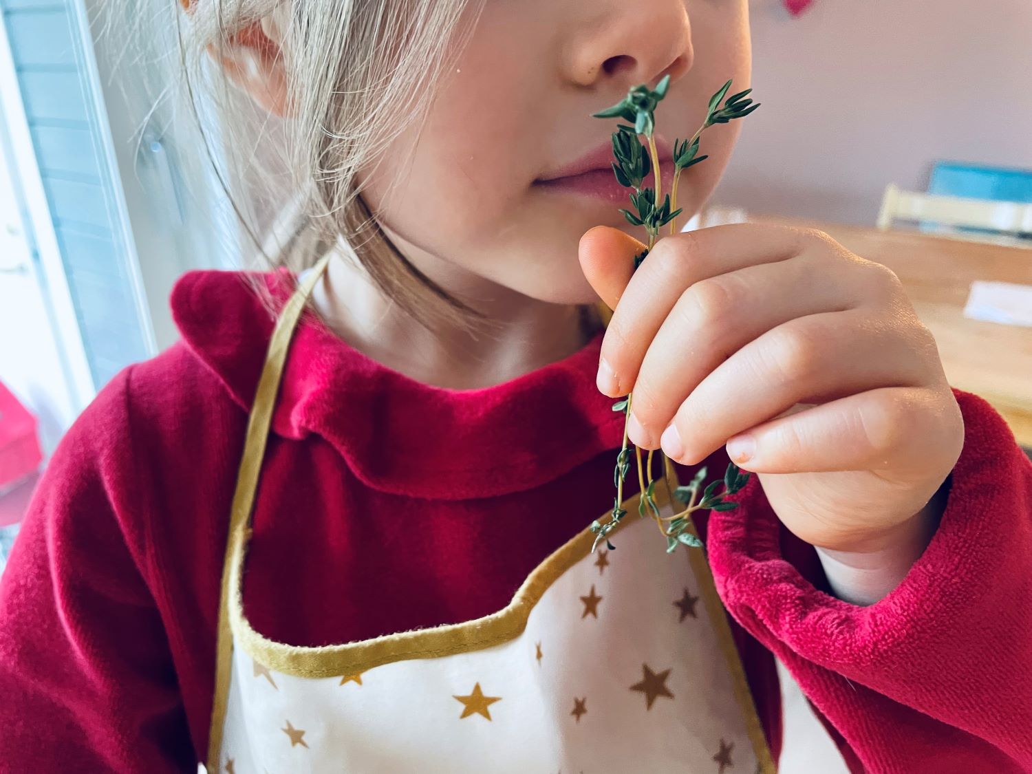 - For barn er det spennende å oppleve at noen ingredienser må behandles før de får sin typiske lukt og smak: Ekte vaniljestang blir forsiktig banket med baksiden av kniven for å frigjøre den herlige duften. Muskatnøtt dufter først når den rives på det lille rivjernet. Også nellik og kanelstenger lukter mye sterkere når de knuses med morteren. Urte-te dufter allerede når boksen åpnes, og enda mer når den brygges.